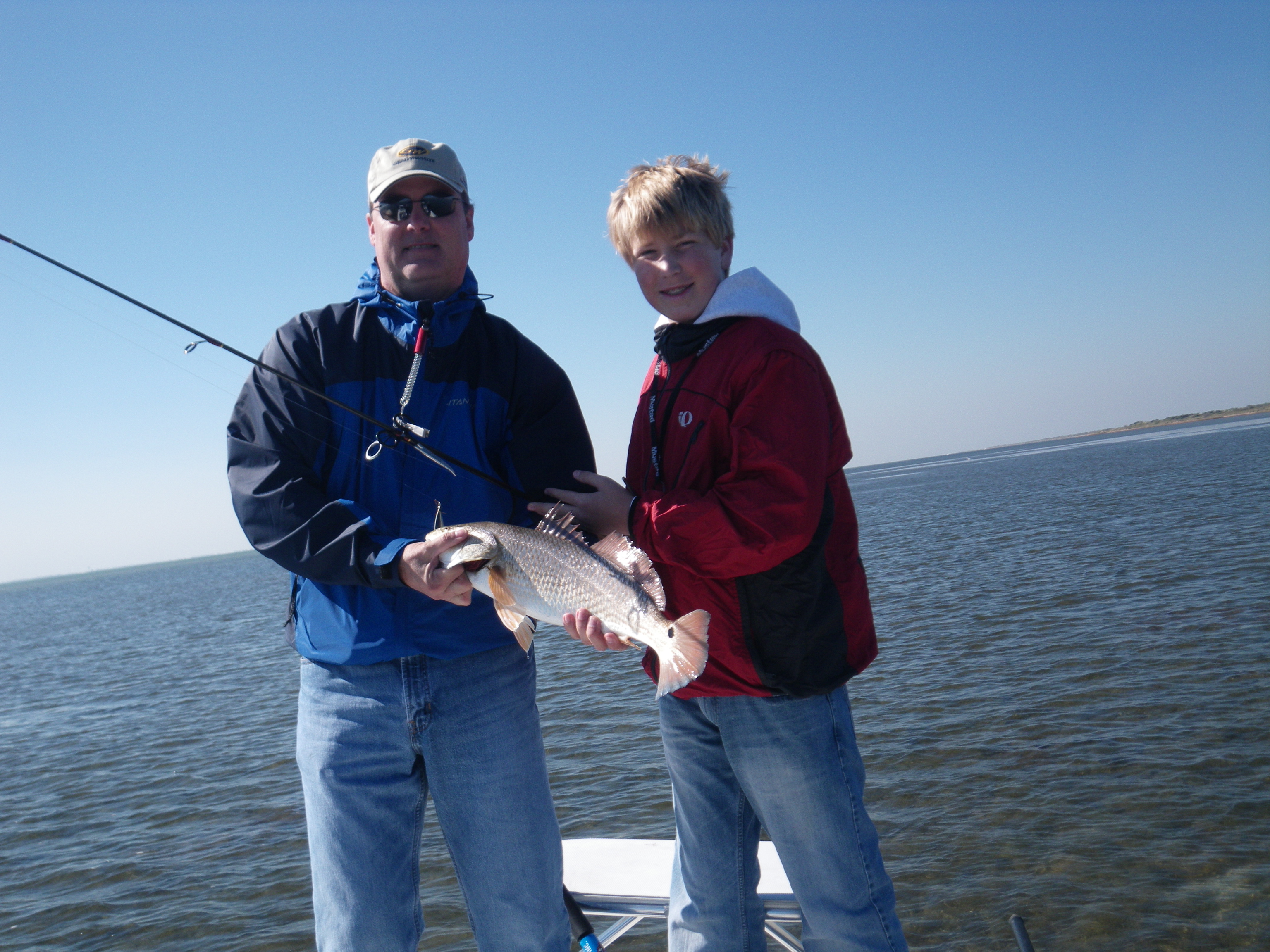I fished Sunday Morning with Bob Bean and his 14 year old son Evan. Day started slow, with way to much boat traffic. We had to do a little running to find a flat that wasn't covered up with boats, yet offer some wind protection. After a little searching and a lot of poling, we found some fish to cast at. They were all up very shallow and quite spooky. We landed 3 reds and had numerous others refuse a gold spoon and soft plastic that Bob and Evan were throwing. The best red was the one in the picture that Evan caught. She was about 25 inches and ate the gold spoon. There were some great reds and a handful of very nice trout up on this particular flat. Unfortunately, none of them were very cooperative. Darn, I guess that we will have to go back and try again.