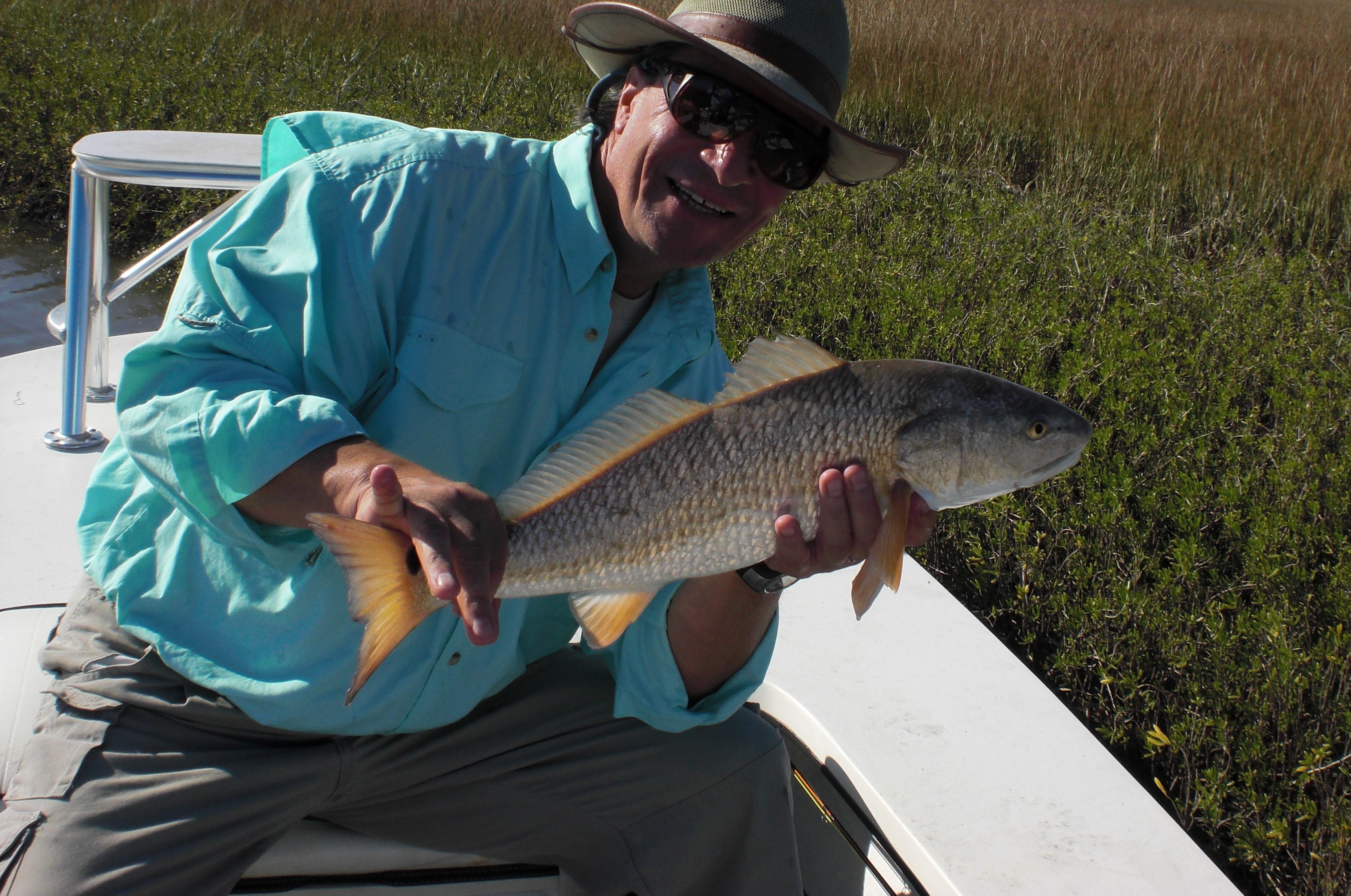 Sunday was fly and light tackle, sight casting day with Mike Hrubetz. Things were well into the downhill mode by now. Wind returning from the East side and even though we have huge tide movement going out, the tide level just didn't drop as much as I would have expected. We saw some reds on the shouth side, but most were very spooky and with intermittent cloud cover, we didn't get many legit shots before the fish were spooked. Finally around 11:30 with no fish landed, we headed to a marsh spot up a bayou. This is when the day finally turned for us. We landed 6 reds in about 45 minutes to finish out the day. The first two were both 19, then two little ones, then a 24, and a 26.5. The two bigger fish were sight cast in a shallow bayou about 15 feet wide. It was awesome how many fish were stacked up in there and catching them when they have no where to run is a hoot. The later fish was Mike's best to date. It was a decent salvage for a very tough day.