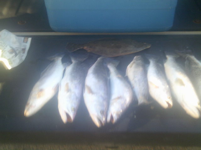 Termo and myself got out today and ground it out. The boat ride to the first spot had us looking back at the truck and wondering about what we were doing. Ended up with 8 keeper trout and that many throwbacks. Termo had a keeper flat and we lost 2 at the boat. Bite on average every 20 minutes but hung in there. Fish caught on soft plastics in 6' water over mud.