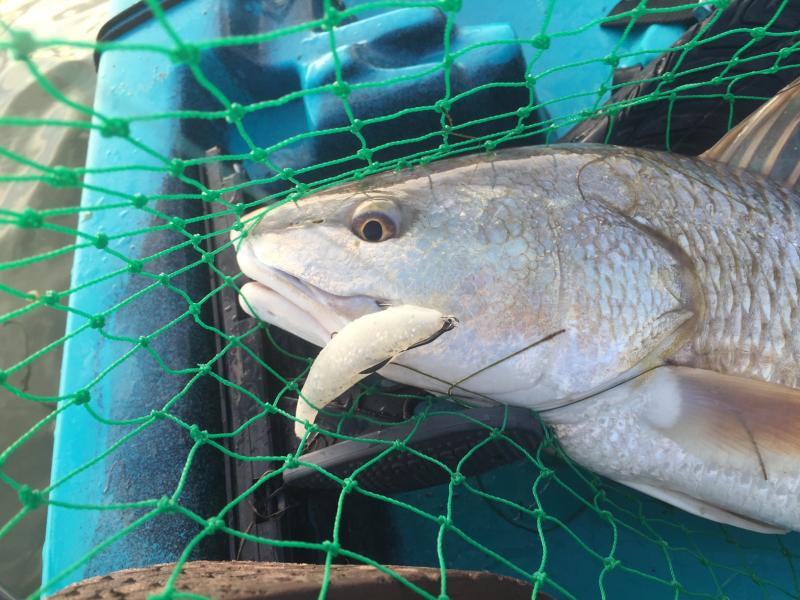 Went Kayak fishing in West Bay South shoreline Sunday morning (10/8). Was out by first light and initially pretty windy, though the wind did eventually lay and the water clarity was still pretty good. The tide was unusually high this past weekend, so I actually had to use my kayak in an area I commonly wade. Ended up with a real nice 27" redfish and a few 14-15" speckled trout (which I released). All fish caught on the Trout Support Lure, Bone Diamond color, with a weighted weedless hook. Definitely recommend trying this lure out if you haven't already!